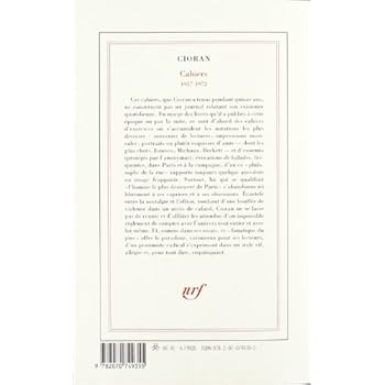 Un ouvrage exceptionnel tant du point de vue des aphorismes multiples d'un tel ensemble de 'Cahiers' qui relèvent de ce genre hybride des "pensées" entre littérature et philosophie, que du point de vue diaristique au travers de multiples notations prises sur le vif. On y découvre la pensée toujours pénétrante, chaque fois reprise et le style remarquable d'incision et d'intensité de Cioran, qui se plait dans les extrêmes, entre le désespoir existentiel le plus radical et les moments, plus rares mais non moins puissants, d'exaltation absolue. Cioran est un écrivain exceptionnel et ses 'Cahiers' sont peut-être son 'magnum opus', tant ils sont riches et variés dans le style si identifiable de leur auteur. On complètera avantageusement cette lecture par l'opuscule du 'Cahier de Talamanca' paru au Mercure de France et incompréhensiblement ôté de cet ensemble dont ils font partie, à l'occasion d'un séjour à Ibiza du grand auteur. On ne peut que regretter que la suite des Cahiers (1972-1995) n'ait pas encore vu le jour et que leur publication soit reportée à une date incertaine (ou jamais...) depuis que la Roumanie en a acquis le manuscrit. Quoi qu'il en soit, il s'agit ici d'un ouvrage majeur pour qui s'intéresse à l'?uvre de Cioran, aux journaux ou à tout écrit fragmentaire du type aphorismes ou pensées...