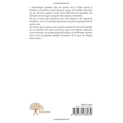 « Psychologue pendant plus de quinze ans à l'Aide sociale à l'enfance, travaillant essentiellement auprès de familles d'accueil, j'ai pu observer quelles étaient leurs difficultés au quotidien, les obstacles et les risques auxquels elles étaient confrontées. J'ai pu, à travers les entretiens avec mon équipe et les assistants familiaux, suivre l'évolution des jeunes sur cette longue période de quinze ans. Au terme de ces quinze ans, je peux constater le travail de qualité de ces familles d'accueil, travail qui, pour être efficace, nécessite une formation, un soutien professionnel par les différentes équipes mais aussi de grandes qualités humaines de la part de chaque intervenant.